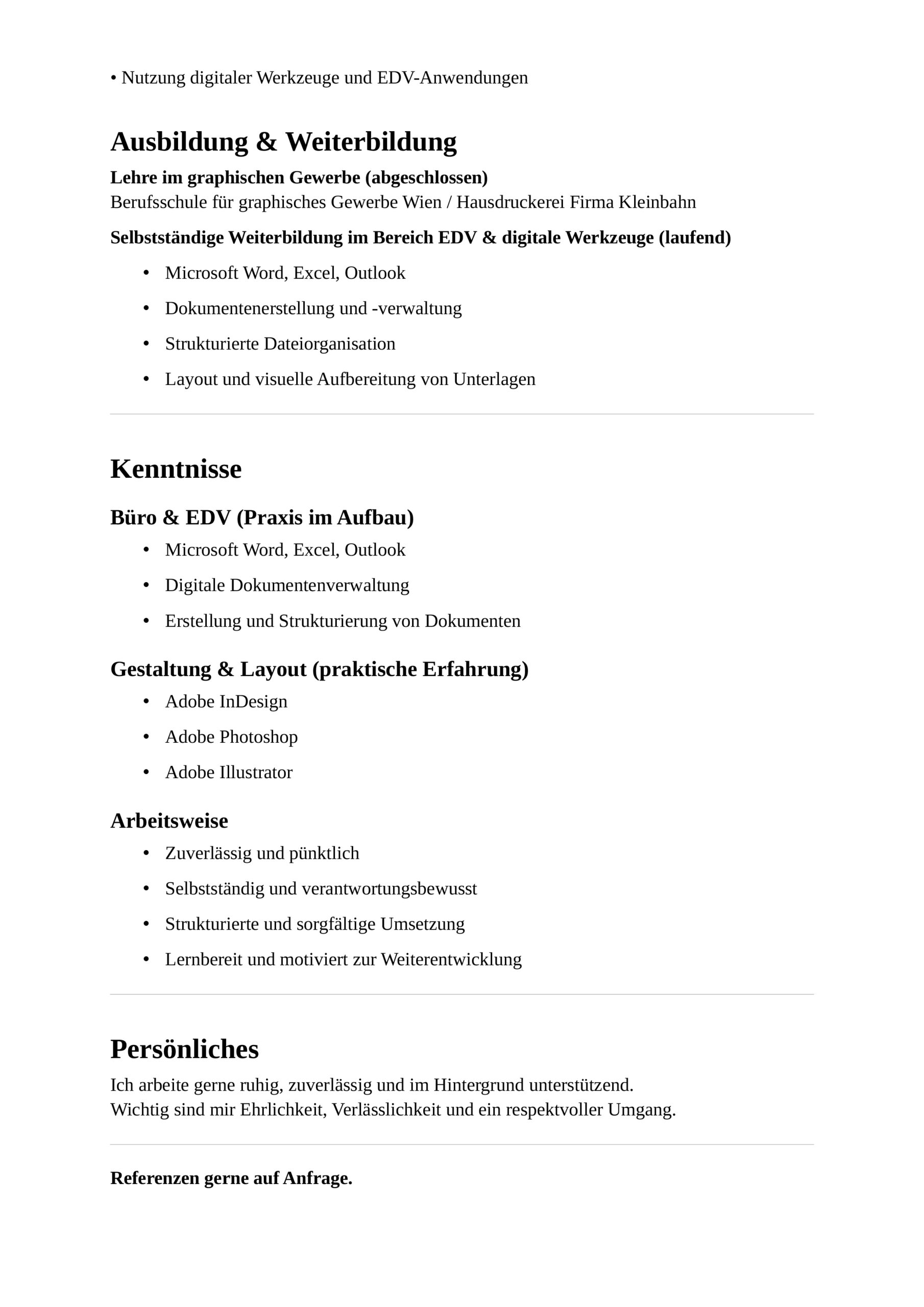 Hier finden Sie eine kompakte Übersicht über meinen beruflichen Werdegang, meine Qualifikationen und meine Kenntnisse mit Schwerpunkt auf Büro, Organisation und EDV.